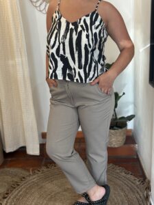 tiro alto, cuenta con cierre y boton , en la parte trasera tiene elastico para un mejor calce, comodidad y amplitud en la prenda.